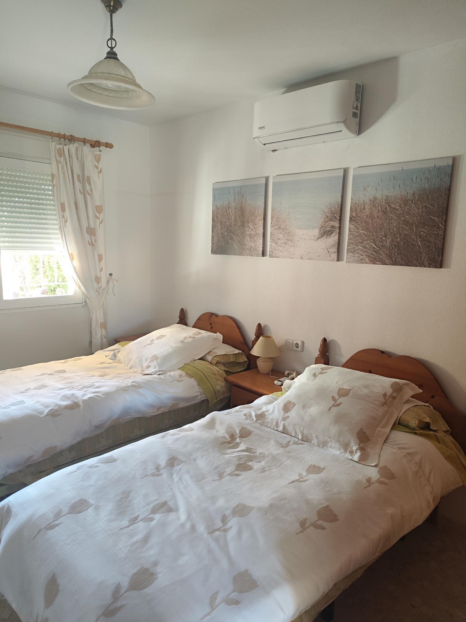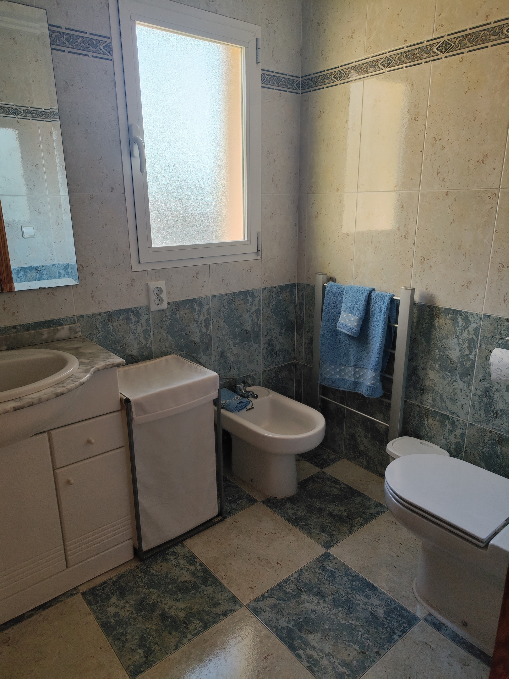 La planta superior está destinada principalmente al descanso. Aquí se ubica el dormitorio principal con cama de matrimonio, luminoso y tranquilo, junto a un segundo dormitorio equipado con literas, pensado claramente para los más pequeños de la casa. En esta planta se encuentra también el segundo baño completo, con bañera, ideal para los momentos de relax tras un día de playa o piscina.