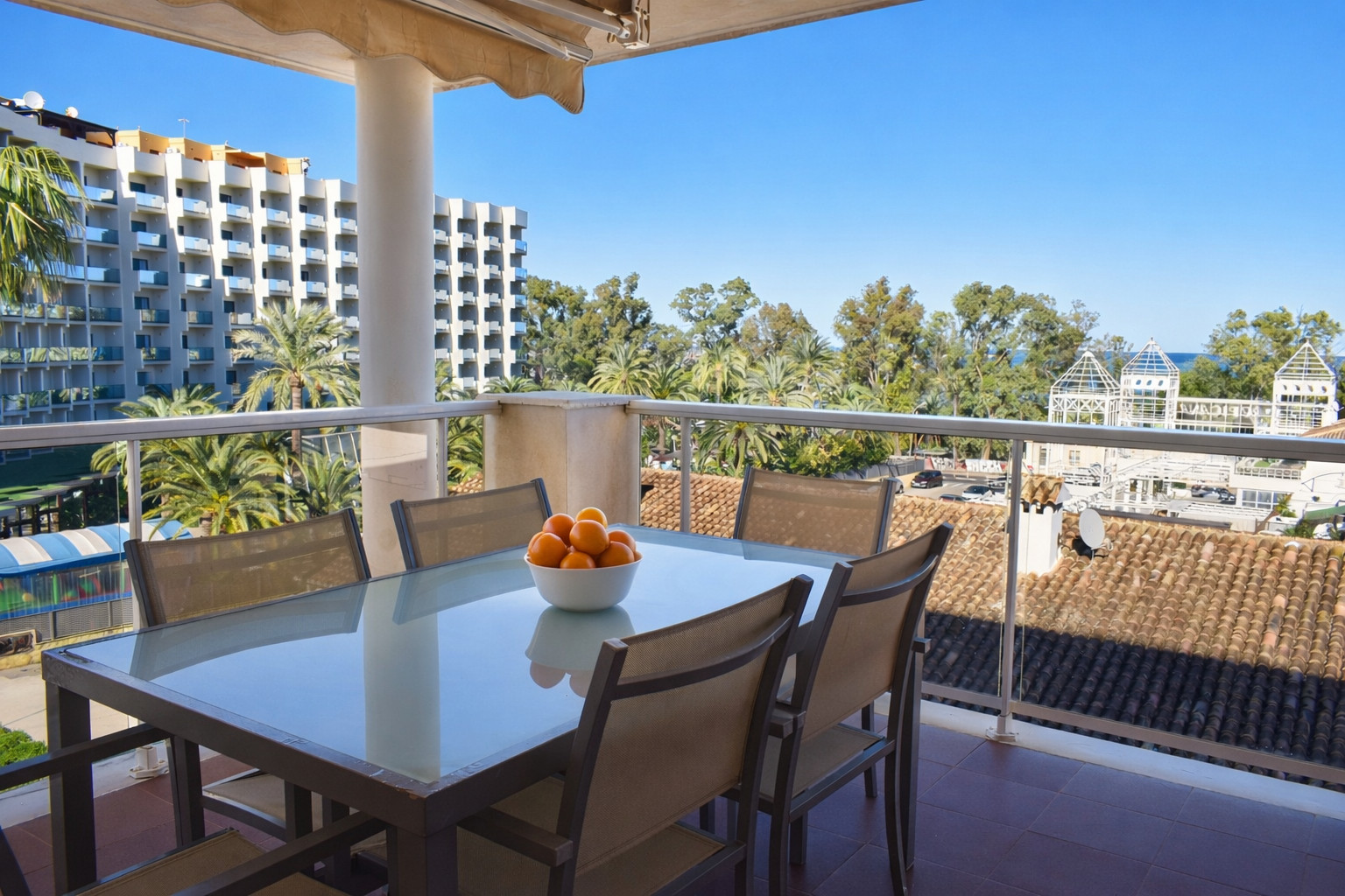 The terrace is undoubtedly one of the apartment’s most special features. Furnished with a large table for six people and offering open views of the swimming pool, the communal garden and the sea, it is the perfect spot for outdoor breakfasts, family dinners or simply relaxing while watching the afternoon light fade over the Mediterranean. The views combine the charm of the residential surroundings with the appeal of the coastal landscape, creating a pleasant scene at any time of day. The terrace is partially covered, allowing you to enjoy it even during the hottest hours of summer or on cooler days.