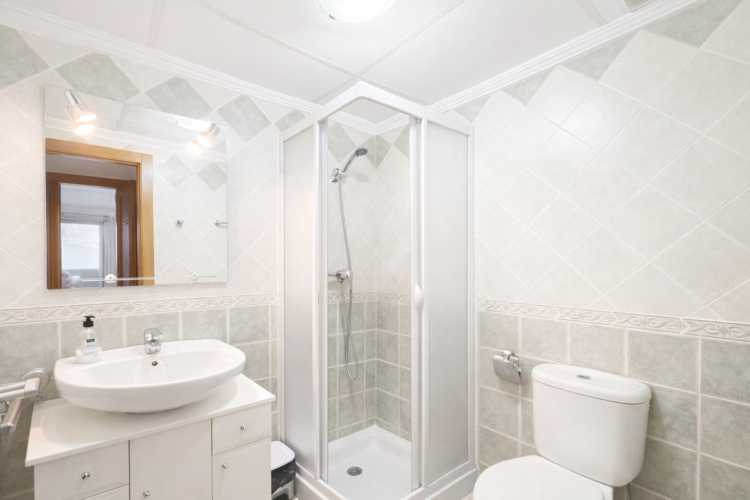 - bathroom with single washbasin, shower and toilet