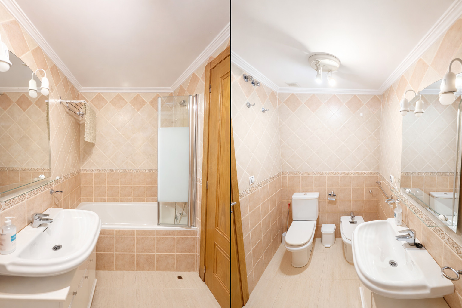 - en-suite bathroom with single washbasin, bath/shower combination, bidet, toilet and hairdryer