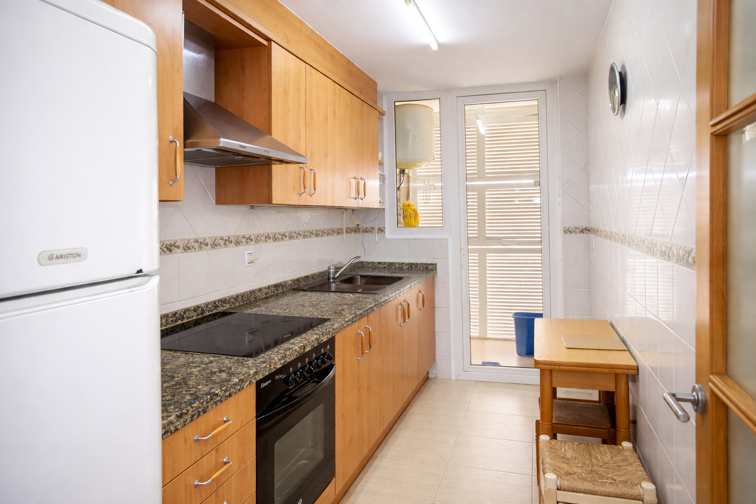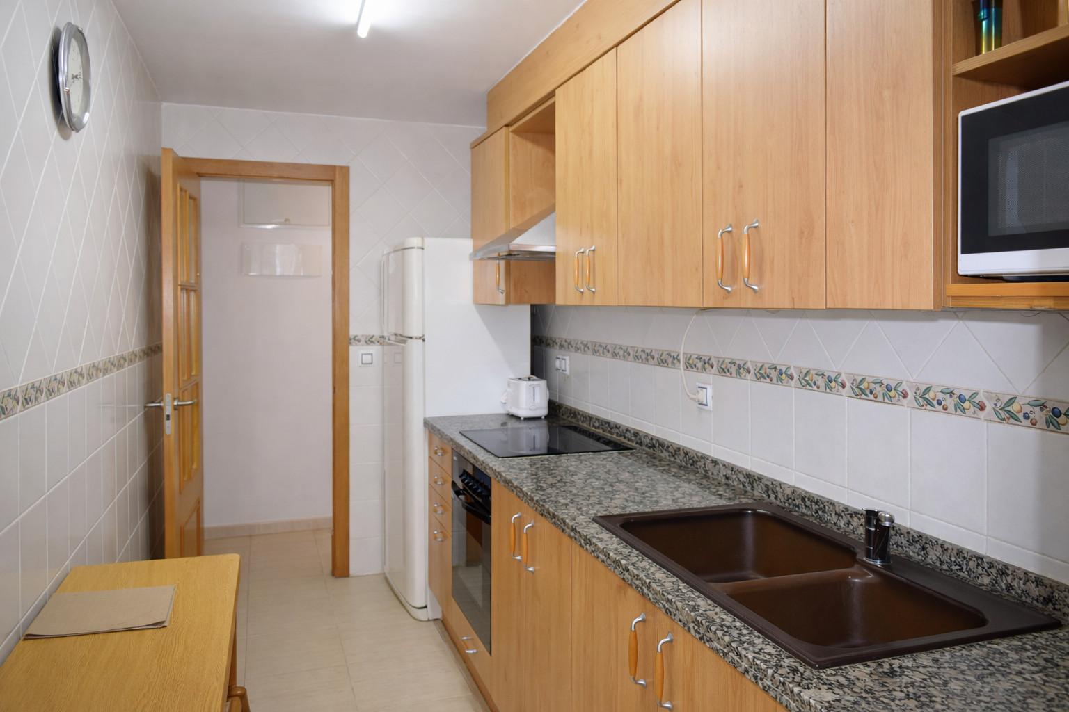 - kitchen with electric hob, electric oven, microwave, refrigerator-freezer, coffee machine, mixer and toaster
