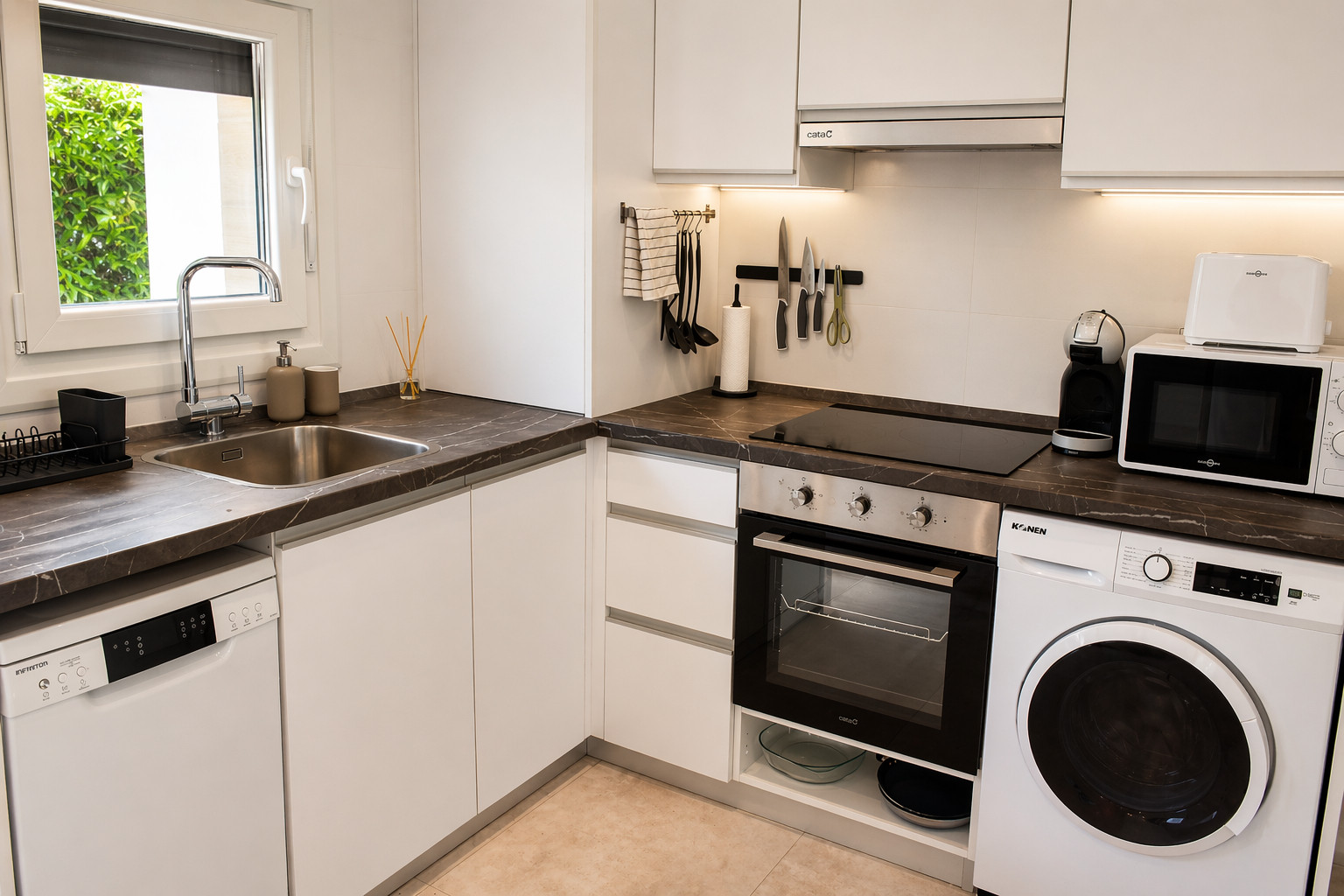The American kitchen, equipped with a ceramic hob, is fully prepared with a fridge, freezer, oven, microwave, dishwasher, coffee maker and all necessary utensils, facilitating practical and worry-free stays. The apartment has air conditioning in all rooms, heat pump heating, wifi connection and television, ensuring comfort throughout the year.