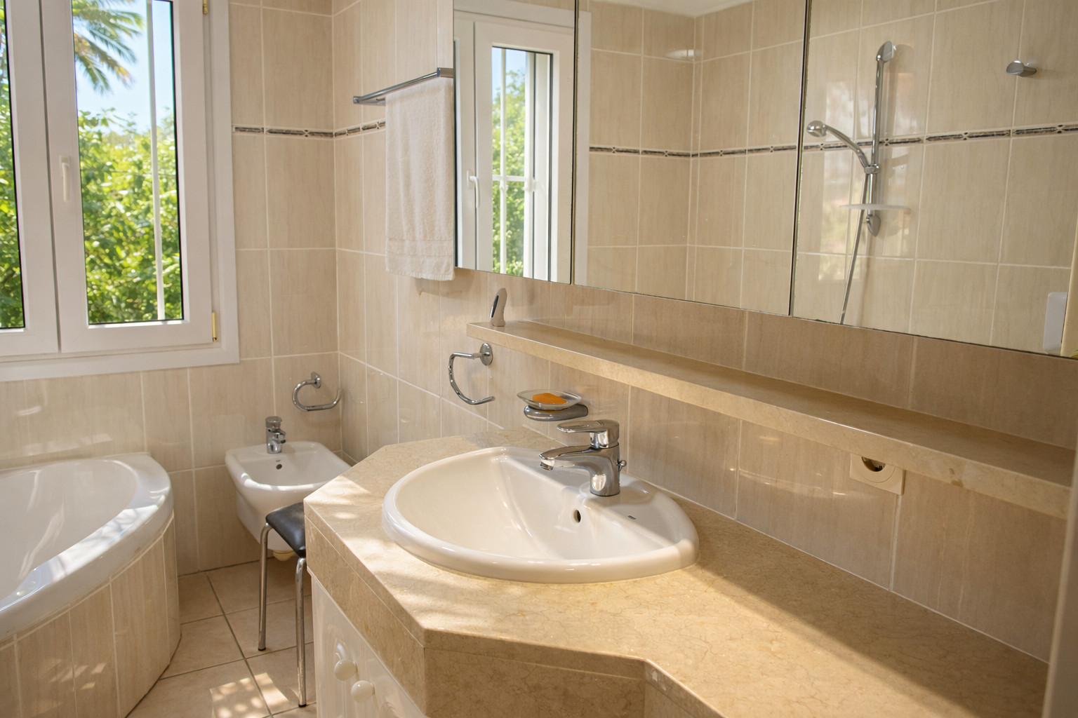 On the ground floor, there is one of the bedrooms, very practical for those who prefer to avoid stairs or seek greater independence. On this same floor, within the bedroom, there is a full bathroom with a bathtub, ideal for relaxing after an active day.