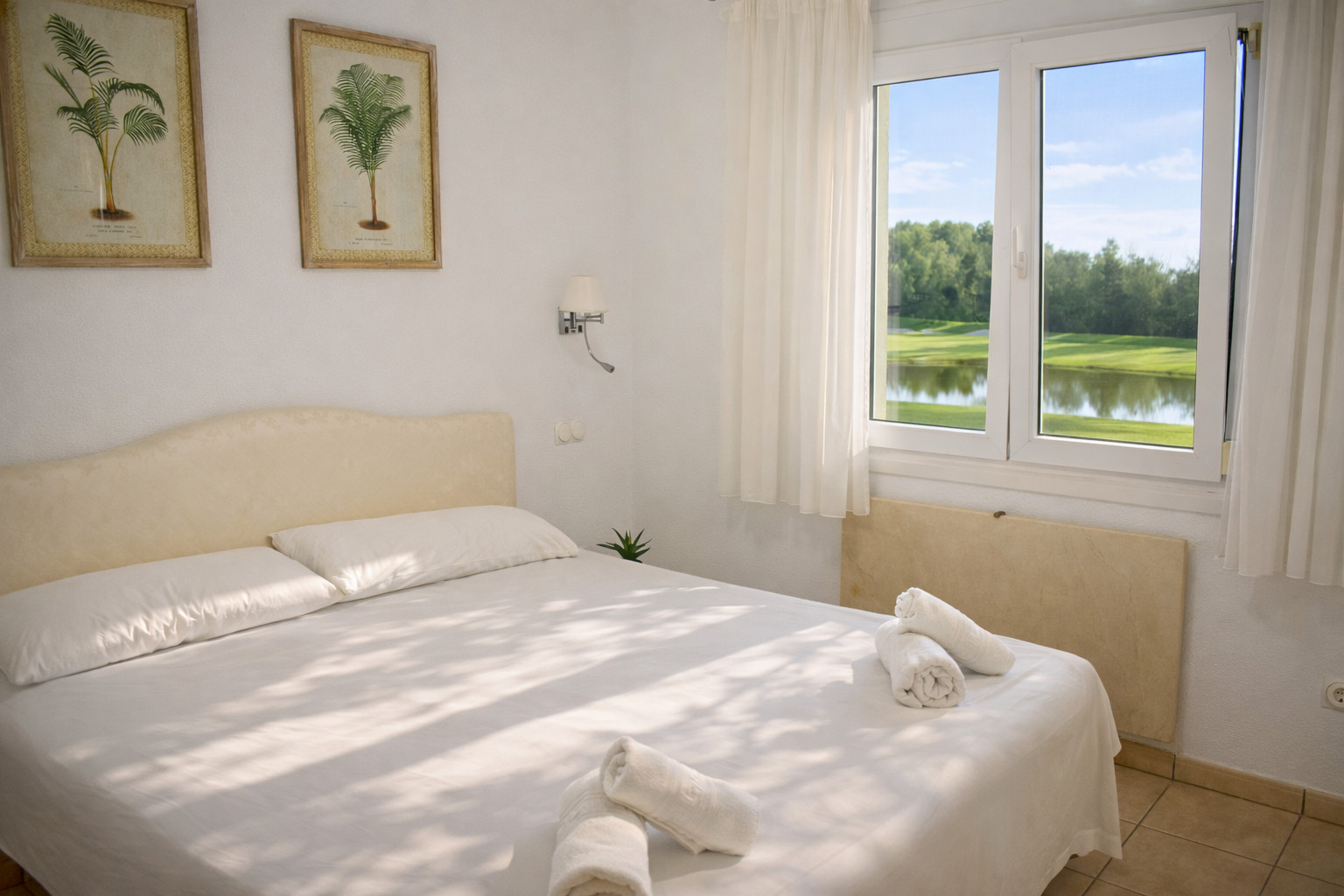 The upper floor houses the other two bedrooms, both bright and with pleasant views of the golf course and the lake. On this floor is the second full bathroom, equipped with a shower, which facilitates coexistence and provides additional comfort to guests occupying the upper area.