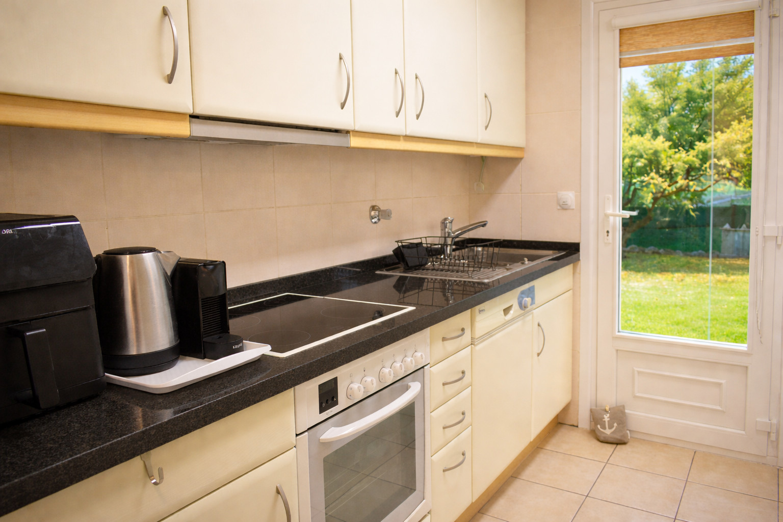 The kitchen, closed and fully equipped, has an oven, ceramic hob, microwave, dishwasher, coffee maker and complete kitchenware, which allows comfortable cooking both in short and long stays. From the kitchen, direct access to the private garden is possible, facilitating the use of the exterior and providing a pleasant connection between interior and nature.