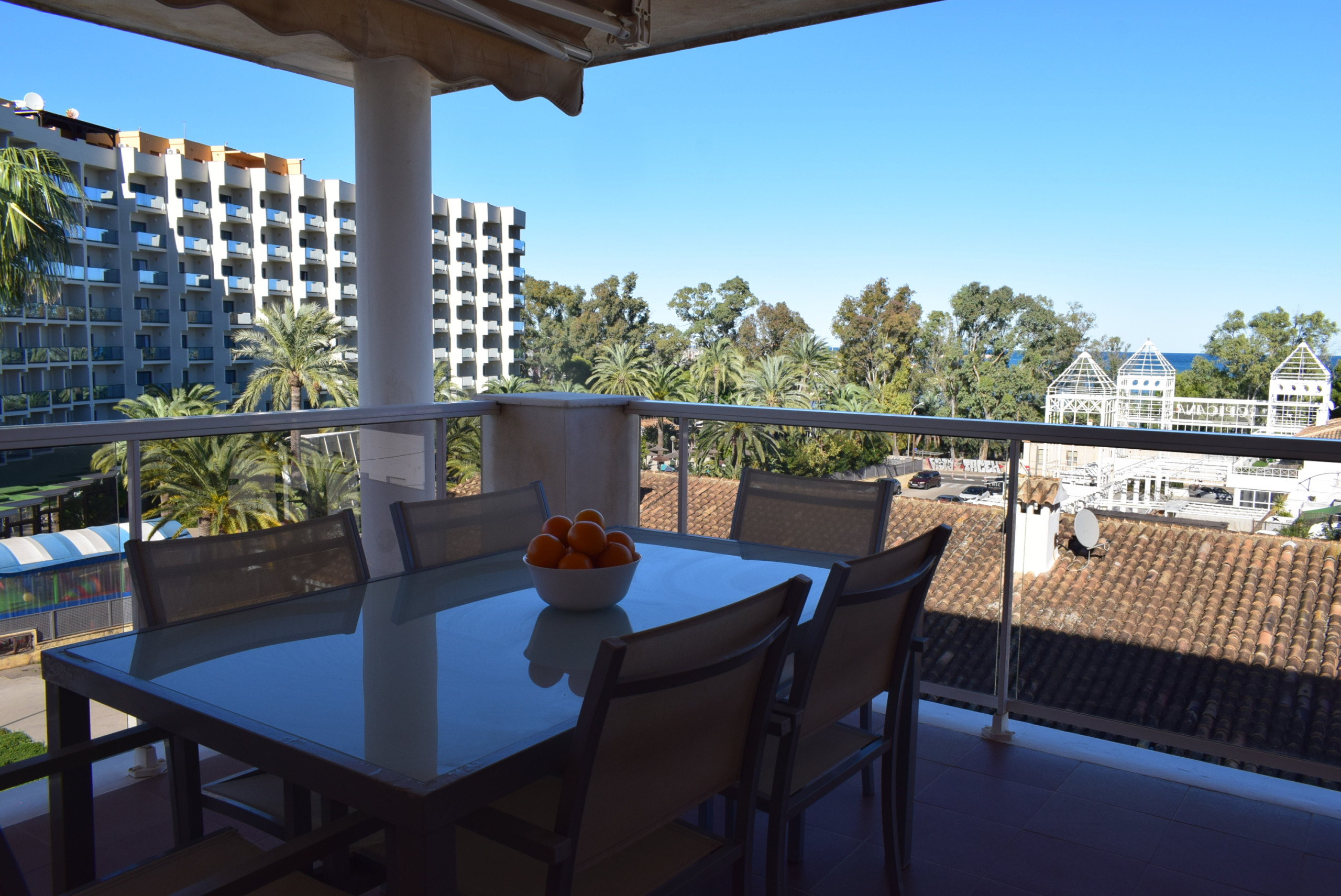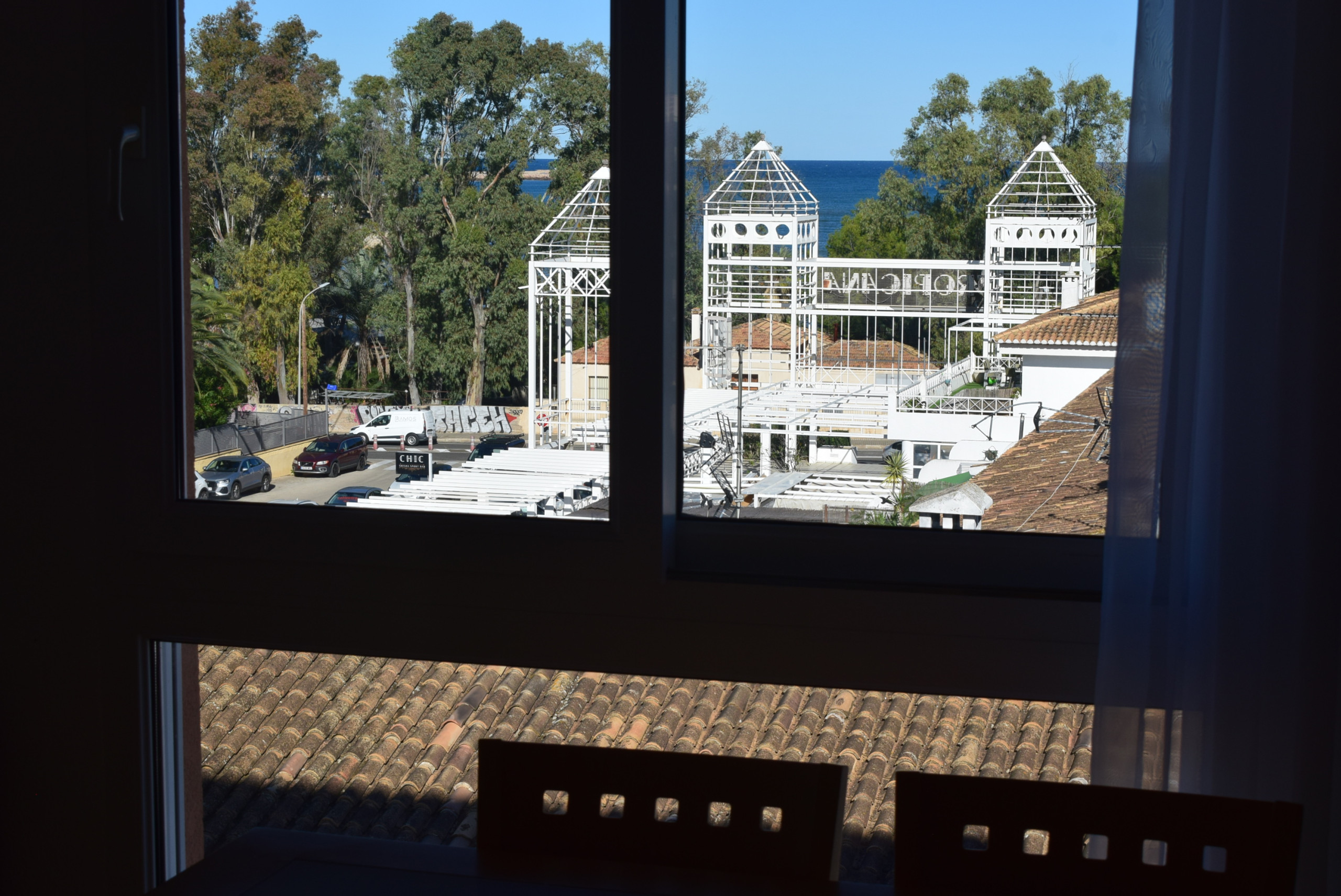 La terrasse est sans aucun doute l’un des espaces les plus remarquables de l’appartement. Aménagée avec une grande table pour six personnes et offrant des vues dégagées sur la piscine, le jardin commun et la mer, elle est parfaite pour prendre le petit-déjeuner en plein air, dîner en famille ou se détendre en observant la fin de journée sur la Méditerranée. Les vues associent le charme du cadre résidentiel à l’attrait du paysage côtier, offrant un panorama agréable à toute heure. La terrasse est partiellement couverte, ce qui permet d’en profiter même pendant les heures les plus chaudes de l’été ou lors de journées plus fraîches.