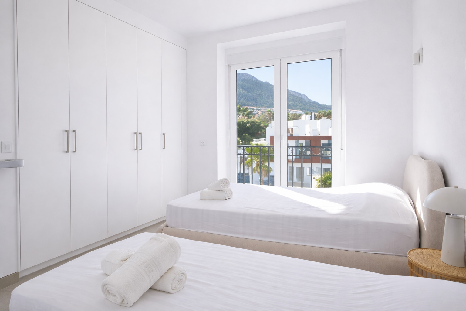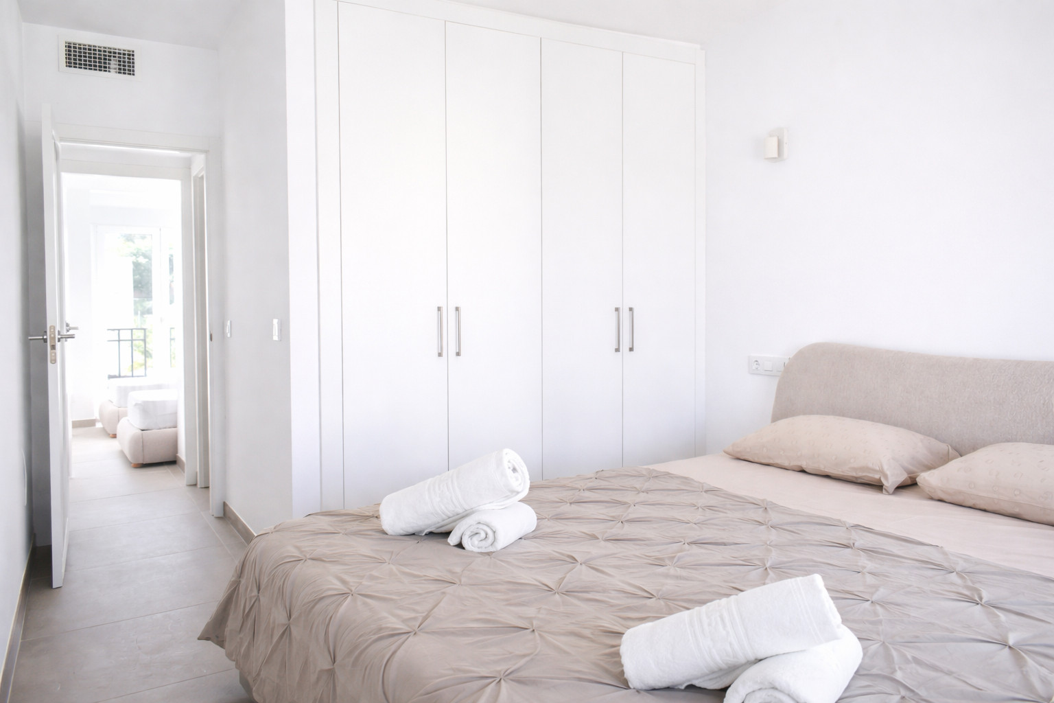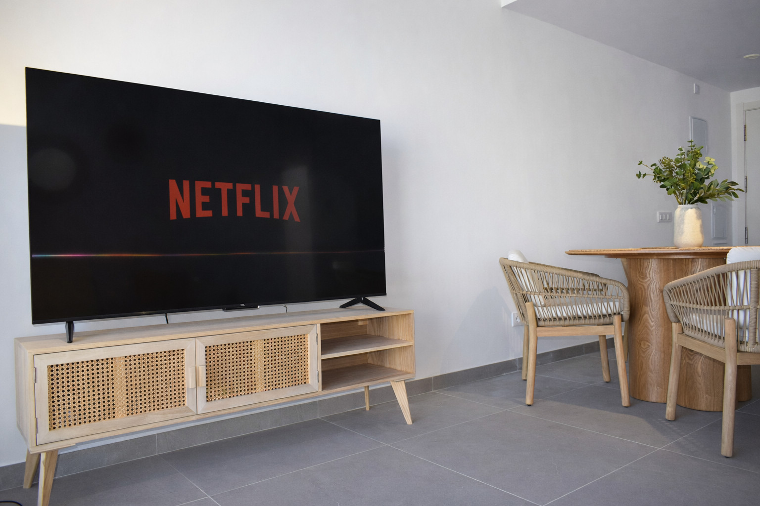 La salle à manger, avec sa table ronde en bois et ses chaises confortables en fibres naturelles, invite à de longues conversations après le repas. La décoration combine des tons neutres, des textiles doux et des détails chaleureux qui apportent de la personnalité sans surcharger l'ambiance. Le salon, équipé d'un canapé confortable et d'une télévision par satellite, s'ouvre directement sur la terrasse privée à travers une grande baie vitrée coulissante. Cette connexion intérieur-extérieur est l'un des grands attraits de l'appartement, car elle permet de profiter de la lumière méditerranéenne tout au long de la journée.
