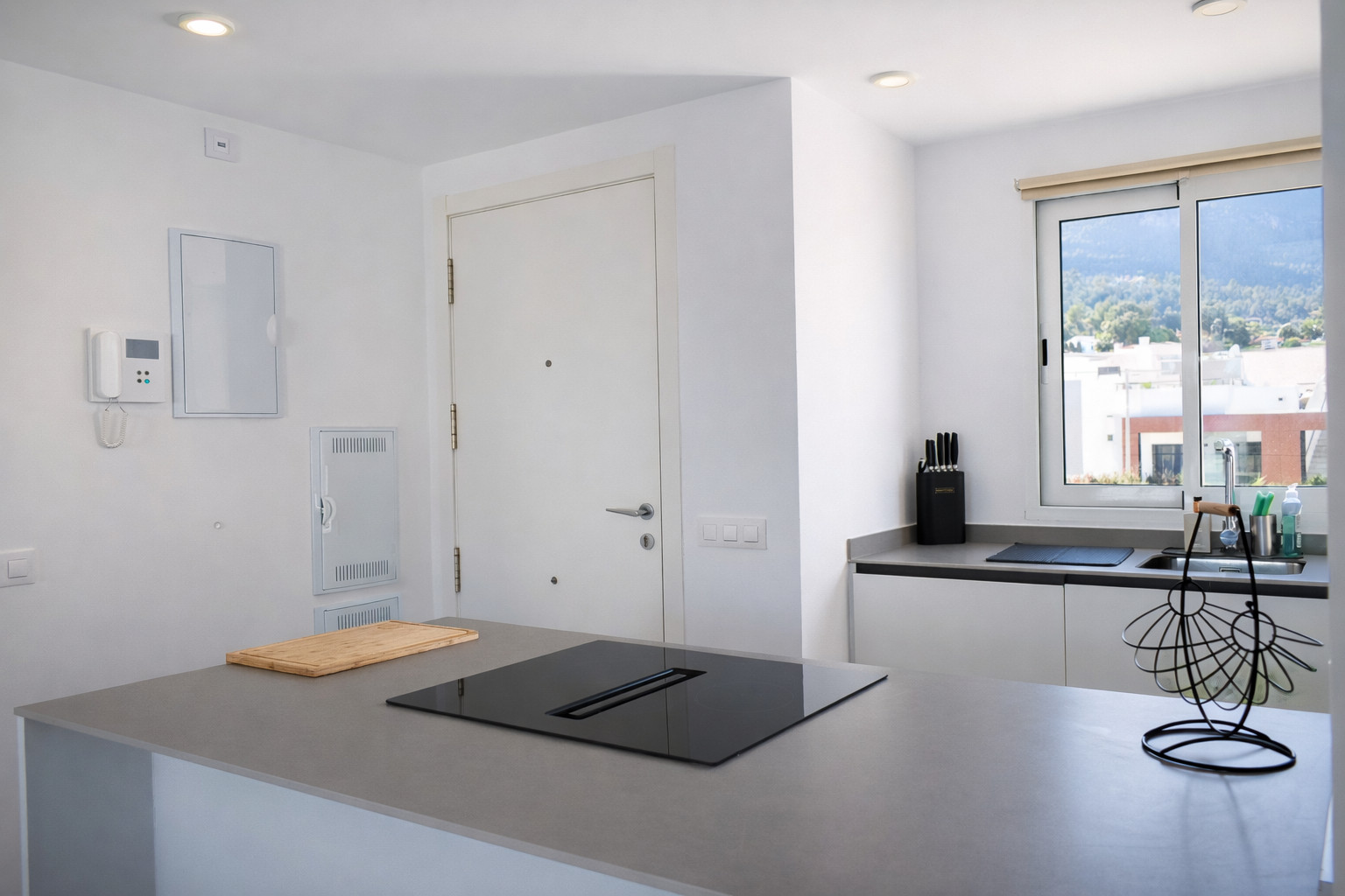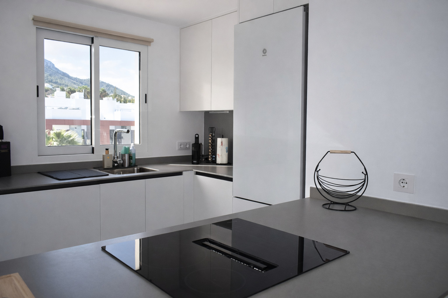 La cuisine américaine, moderne et entièrement équipée, dispose d'une plaque vitrocéramique intégrée dans une élégante péninsule, d'un four, d'un micro-ondes, d'un lave-vaisselle, d'un réfrigérateur, d'une cafetière et de tous les ustensiles nécessaires pour des séjours courts ou longs. C'est un espace pratique tant pour préparer un petit-déjeuner léger avant de descendre à la piscine que pour cuisiner tranquillement un dîner en famille. La fenêtre donnant sur la terrasse extérieure apporte de la lumière naturelle et de la ventilation, renforçant la sensation de fraîcheur qui définit l'ensemble du logement.