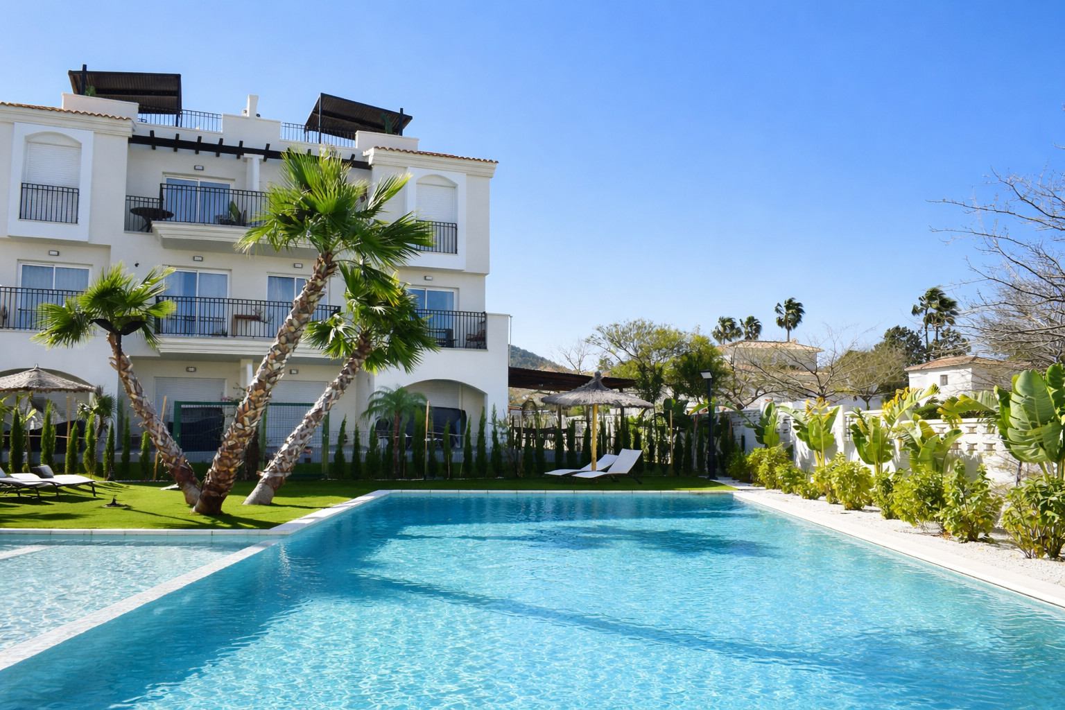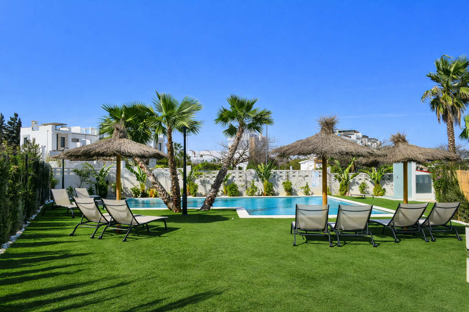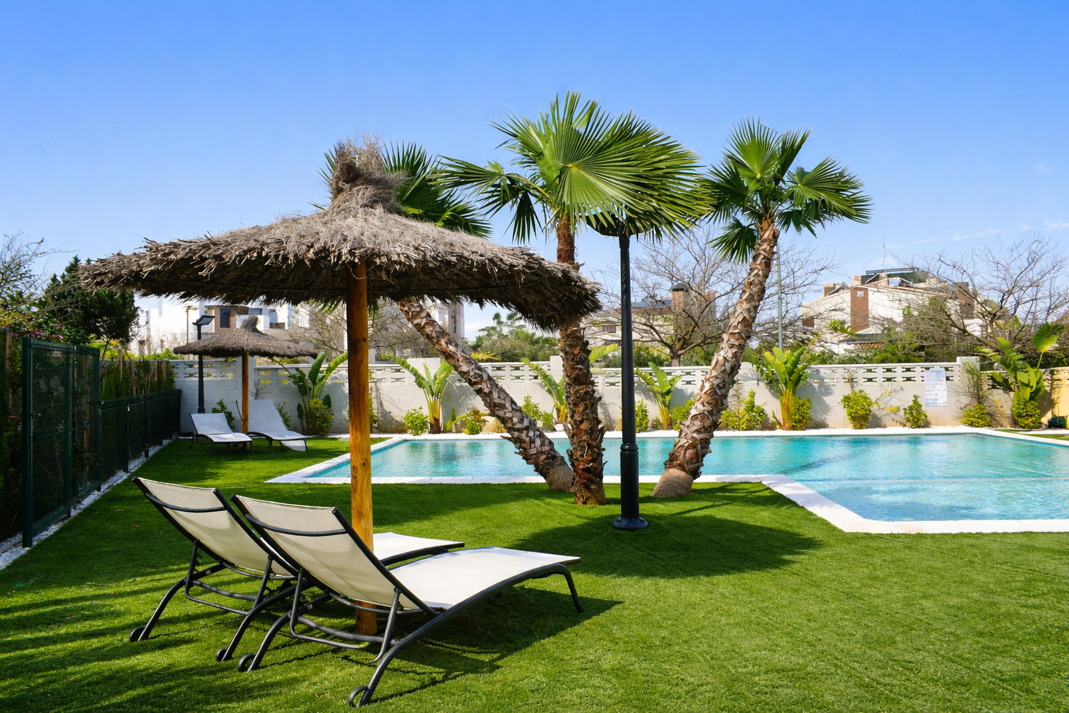 L'un des grands attraits du complexe résidentiel est sa piscine communautaire soignée, entourée d'espaces verts et de palmiers qui évoquent l'ambiance typiquement méditerranéenne. Il dispose également d'une piscine pour enfants, ce qui en fait un appartement idéal pour les familles avec des enfants qui recherchent le calme et la sécurité dans un environnement résidentiel. La zone paysagère permet de profiter de l'air libre sans avoir à se déplacer, devenant un espace de loisirs supplémentaire pendant le séjour.
