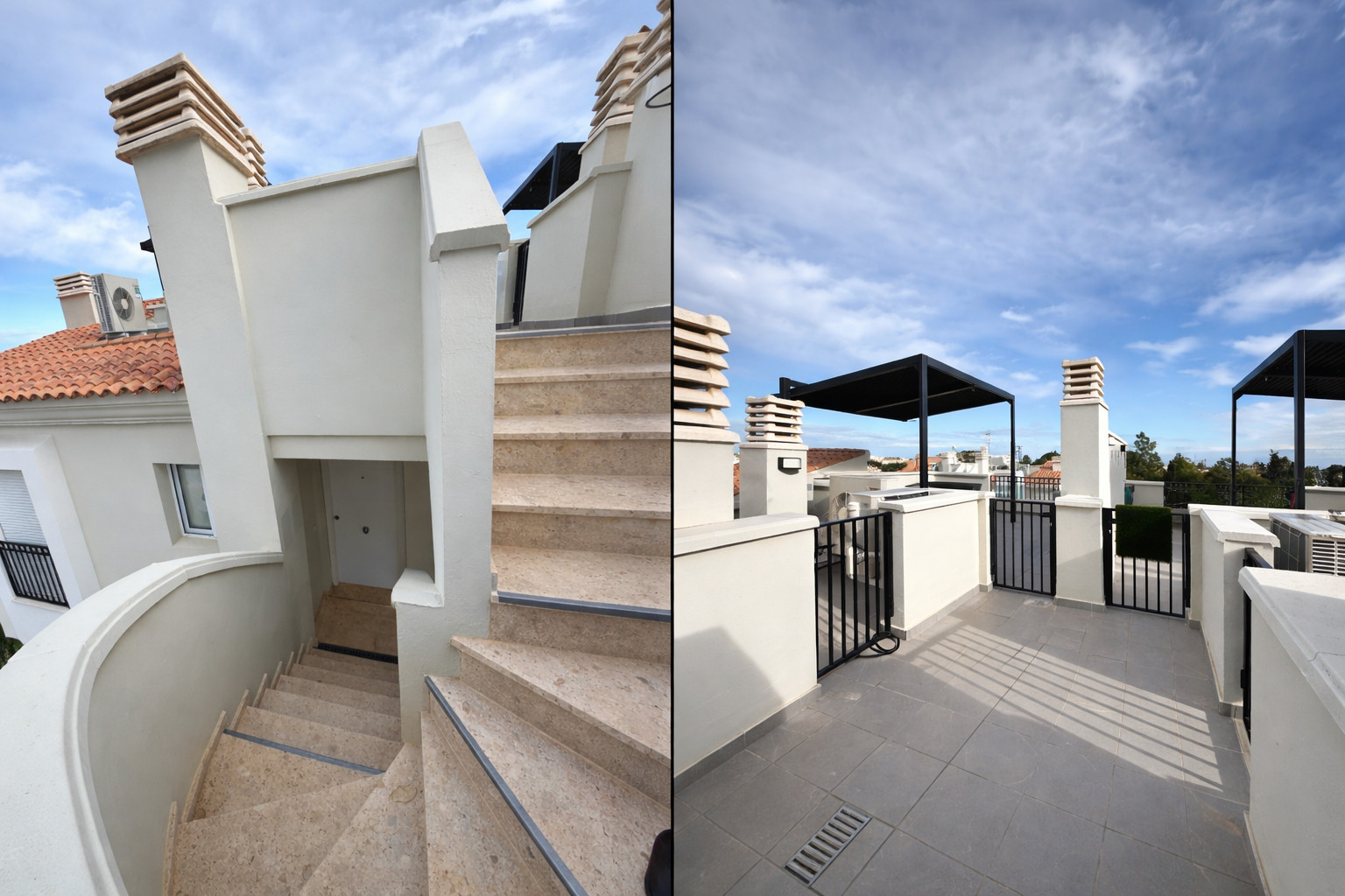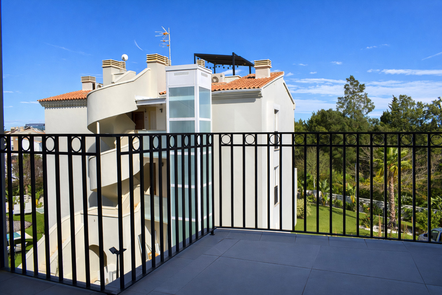 La terrasse devient un coin privilégié pour se déconnecter. De là, on contemple des vues ouvertes sur l'environnement résidentiel et les zones ajardinées, avec le Montgó en arrière-plan et le bleu du ciel comme toile de fond habituelle. C'est l'endroit parfait pour prendre un café le matin, lire au crépuscule ou simplement se détendre après une journée à la plage. De plus, il dispose d'un droit d'accès par l'escalier communautaire à une spectaculaire terrasse privée avec une zone chill out et des vues panoramiques sur la ville, un espace qui apporte une valeur différentielle à cet appartement à Dénia.