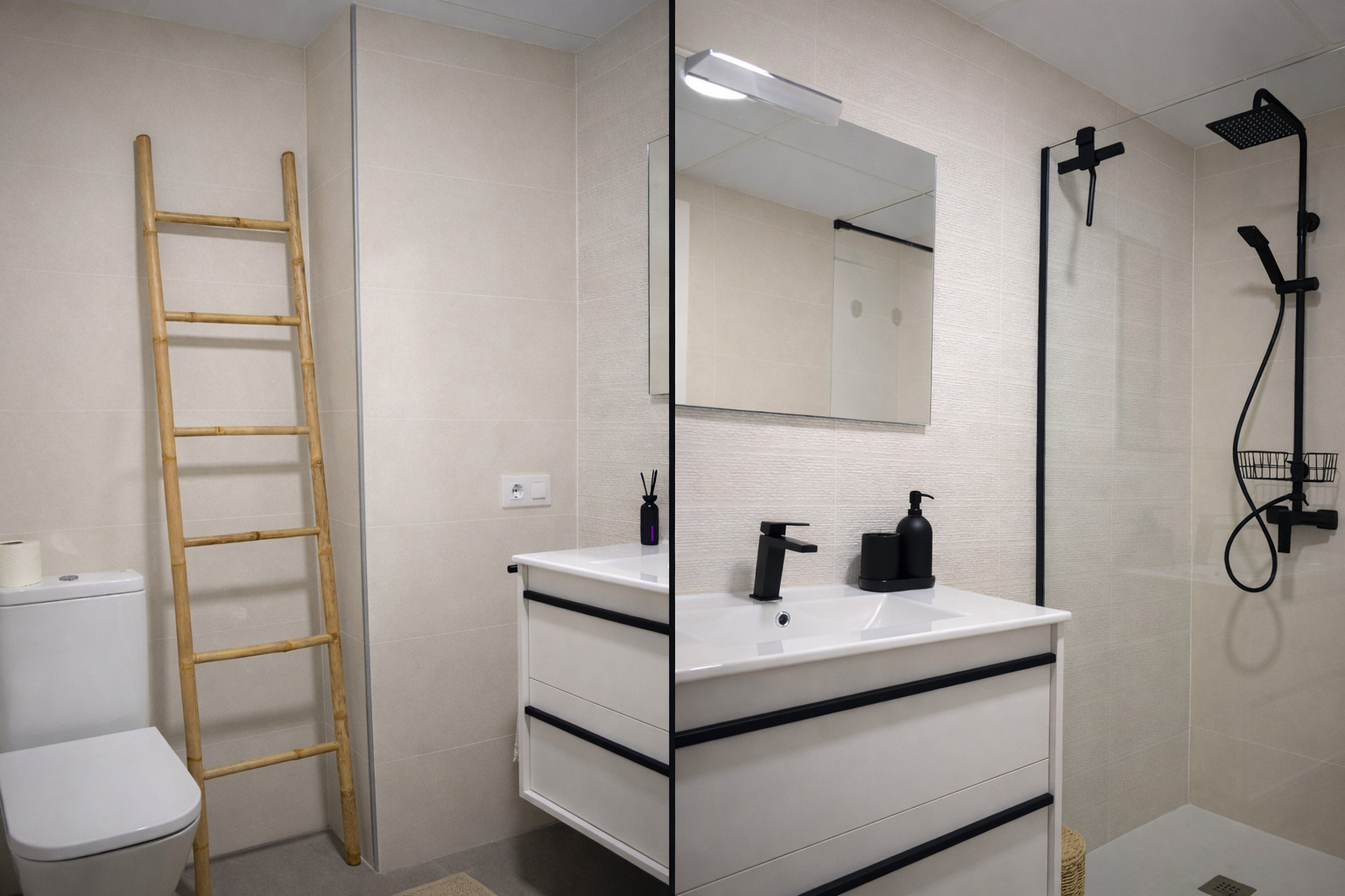 La salle de bain complète présente un design actuel, avec une douche spacieuse, une paroi de douche en verre, un meuble suspendu et des finitions modernes dans des tons neutres. Tout est pensé pour offrir du confort et de la praticité pendant le séjour.