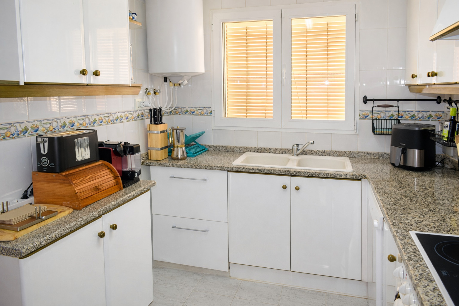 La cuisine, fermée et entièrement équipée, dispose d'un four, d'une plaque vitrocéramique, d'un micro-ondes, d'un lave-vaisselle, d'une cafetière et d'un équipement complet, ce qui permet de cuisiner confortablement lors de courts ou longs séjours. Depuis la cuisine, on accède directement au jardin privé, facilitant l'utilisation de l'extérieur et apportant une agréable connexion entre l'intérieur et la nature.