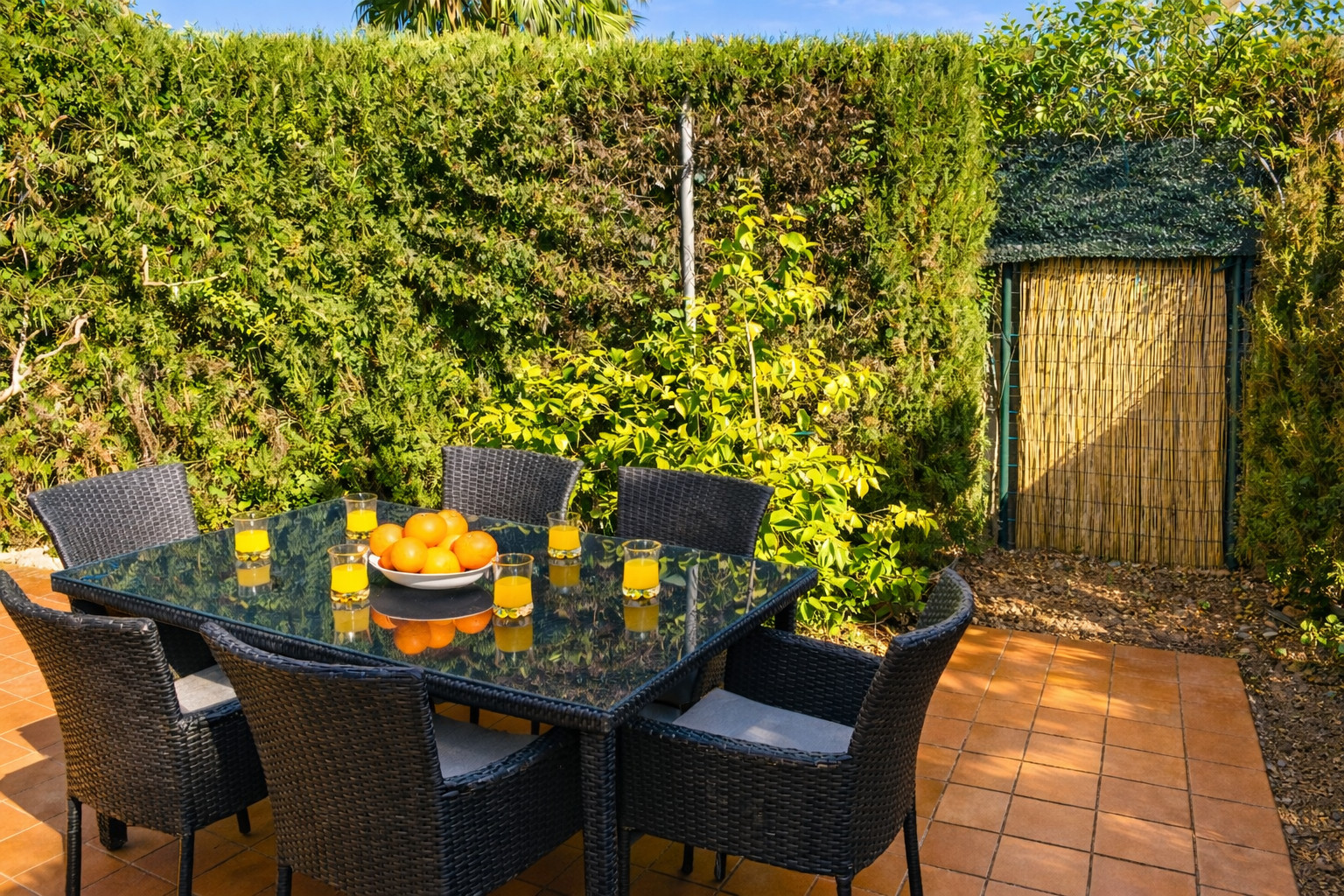 Le jardin borde directement le terrain de golf et n'est pas clôturé de ce côté, ce qui permet de profiter de vues dégagées et d'une sensation de continuité avec le paysage, apportant de l'amplitude et un contact direct avec la nature. Cette conception est particulièrement attrayante pour les invités qui apprécient le calme, les vues dégagées et l'environnement naturel.