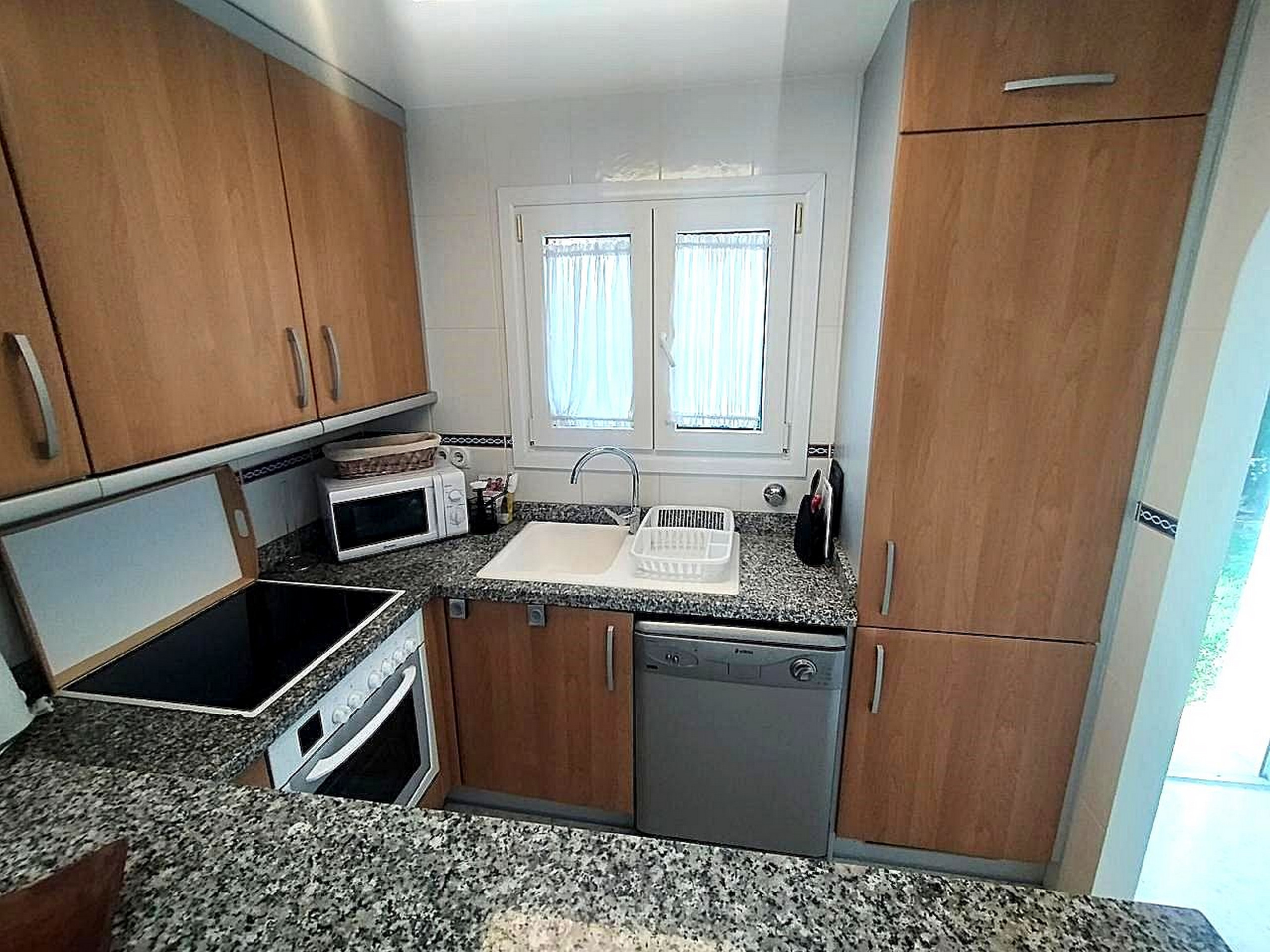 La disposition de la maison garantit confort et intimité à chaque niveau. Au rez-de-chaussée, vous trouverez la chambre principale avec un lit double et une salle de bain attenante, ainsi qu'un salon-salle à manger lumineux qui s'ouvre sur le jardin privé. La cuisine américaine est entièrement équipée avec des appareils modernes tels qu'une plaque vitrocéramique, un four, un micro-ondes, un lave-vaisselle et un lave-linge, idéale pour préparer vos repas tout en profitant de votre séjour. Le jardin, entièrement clôturé, dispose de meubles d'extérieur, d'un barbecue et d'un accès direct à une piscine commune, créant un espace parfait pour la détente en plein air.