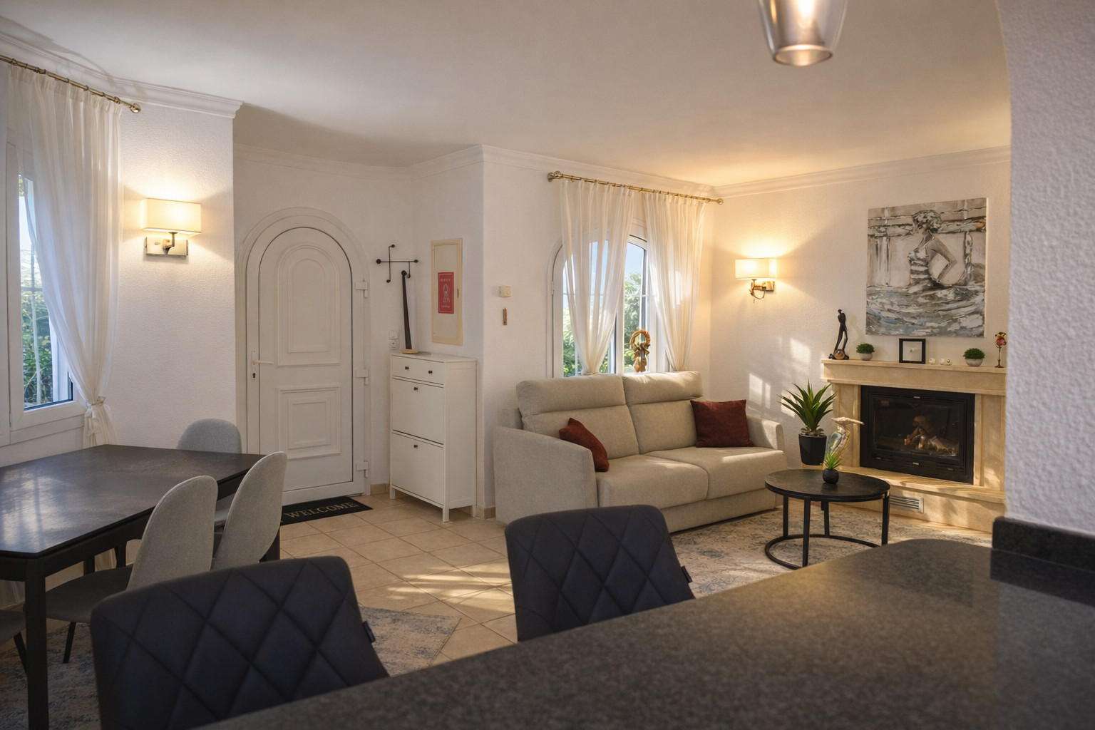 Le salon est spacieux, lumineux et très accueillant. Il est équipé de canapés confortables et d'une décoration soignée. C'est un espace parfait pour se détendre après une journée à la plage, de golf ou d'événements équestres, profiter d'un film, lire tranquillement ou partager des moments en famille.
