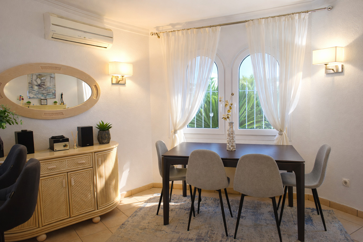 À côté du salon se trouve la salle à manger indépendante, avec une grande table et une lumière naturelle, idéale pour profiter de repas détendus pendant les vacances. Que ce soit un petit-déjeuner tranquille ou un dîner en bonne compagnie, cet espace invite à partager sans se presser.