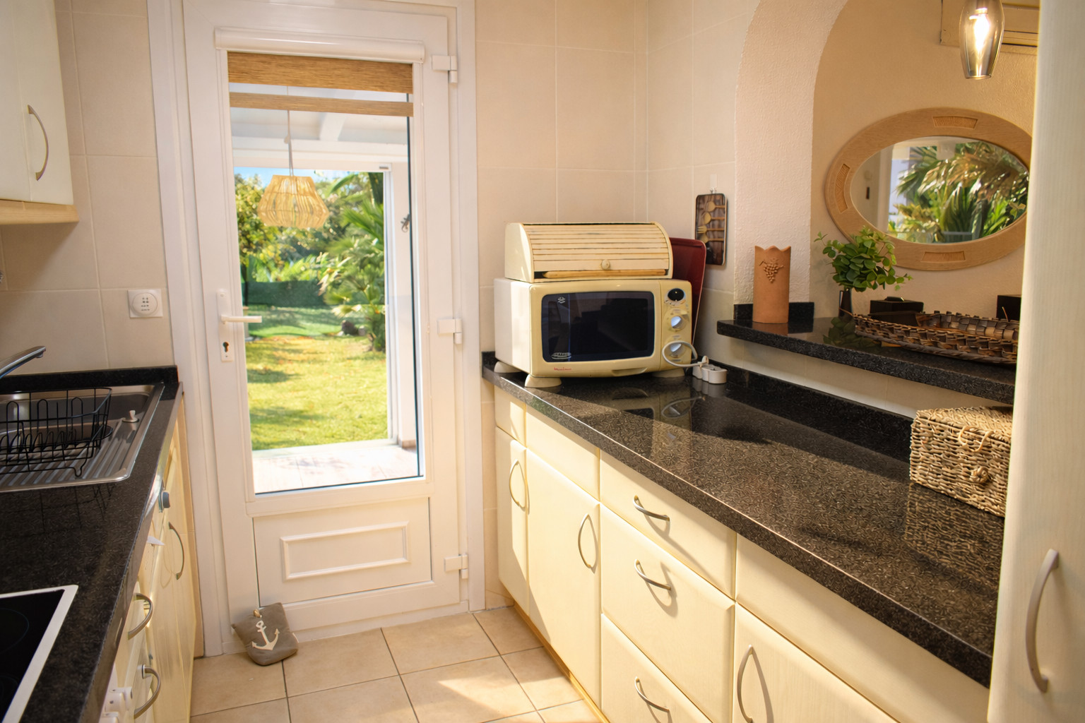 La cuisine, fermée et entièrement équipée, dispose d'un four, d'une plaque vitrocéramique, d'un micro-ondes, d'un lave-vaisselle, d'une cafetière et d'un équipement complet, ce qui permet de cuisiner confortablement lors de courts ou longs séjours. Depuis la cuisine, on accède directement au jardin privé, facilitant l'utilisation de l'extérieur et apportant une agréable connexion entre l'intérieur et la nature.